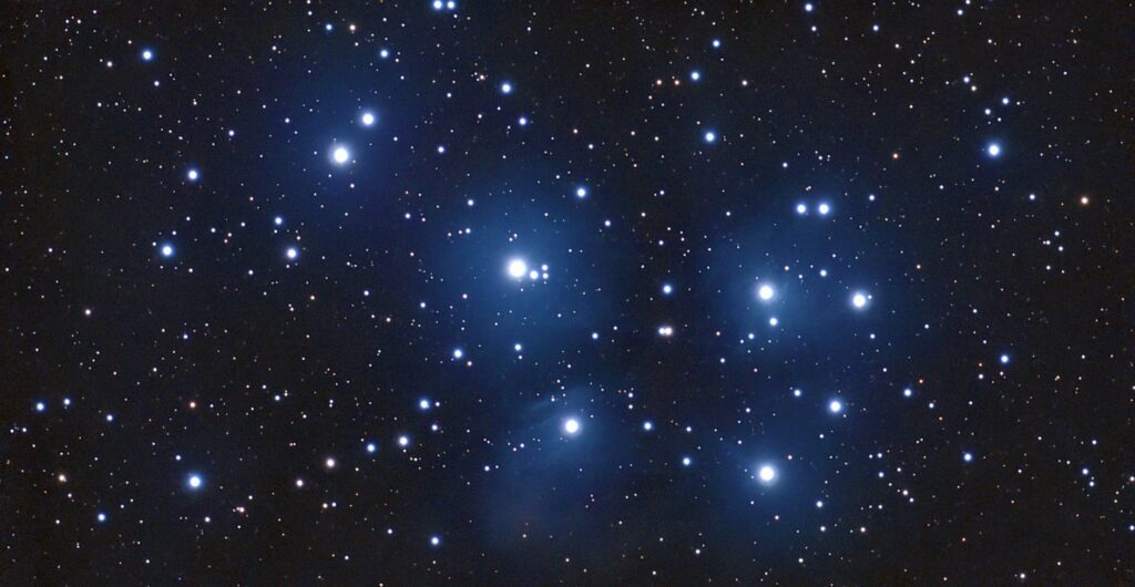 Voor een voorbijganger lijken ze een klein, fonkelend handjevol diamanten dat per ongeluk op het zwarte fluweel van de Stier is gemorst. Maar wie beter kijkt, ziet hun geheime spel. Ze hullen zich in sluiers van kosmosstof, een blauwe nevel die als een zachte adem om hun schouders hangt. Maia, de oudste, waakt met een kalm licht over haar jongere zussen. Merope, de verlegenste, trekt haar sluier soms wat dichter op; zij die ooit een sterfelijke liefde kende en sindsdien iets zachter gloeit dan de rest.